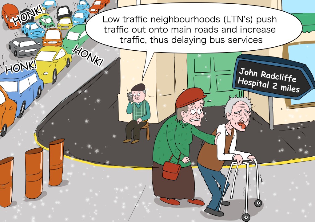 Card 4: How Low Traffic Neighbourhood Schemes (LTNs) are forcing traffic onto main roads, and forcing people of all ages and disabilities to walk or cycle.