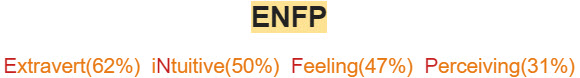 If in fact the percentages for any of the letters are low (i.e. below 14%), you might want to select the letter for the opposing type (the 4 letters come in pairs of E/I; S/N; T/F; and J/P) and read the thumbnail description of this new 4-letter type. So, for example, if your 4-letter type first comes out as INFJ and the % for I is low, then you could read the type for ENFJ instead, swapping the ‘E’ for the ‘I’. You can read the short and long descriptions for the two 4-letter types to see which one fits you best!